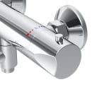Har du børn i huset, giver det en ekstra tryghed at vide, at de ikke ved et uheld kan skrue vandet for varmt da skoldningsspærren ved låser ved 38°, og ønsker du en højere temperatur, kræver det et aktivt tryk på grebet – så du har fuld kontrol uden at gå på kompromis med komforten.