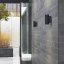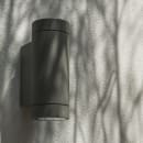 Sort udendørs LED væglampe med cylinderform fra det britiske firma Astro Lighting. Lampen giver både op- og nedadrettet lys, hvilket effektivt oplyser det omkringliggende område. Brug den langs din husmur for at tilføje elegant belysning og lyse gangstien op omkring dit hjem