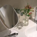 Spejlet er designet til at passe ind i din hverdag og har en praktisk opbevaringsbakke i bunden, så du kan holde styr på dine småting. Den matte overflade og de bløde former giver et roligt udtryk, der let matcher både badeværelse og soveværelse. Med en højde på 29,5 cm og spejlflade på 19,2 x 19,2 cm får du masser af plads til både nærstudier og hurtige tjek, mens bakken på 11 x 17,3 cm samler hårnåle, smykker eller makeup.