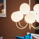 Bianco pendel fra Markslöjd. Pendant i guldfarvet metal og ni hvide glaskugler. 1,5m gennemsigtigt kabel. Monteres med krog. Max 9x20W. G9 fatning. Lyskilder medfølger ikke.