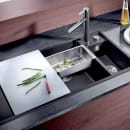 Med til vasken følger et smukt hvidt skærebræt i glas, som kan glides hen over vaskens fulde bredde takket være dens størrelse på 49,7x35 cm.