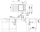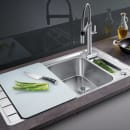 Der medfølger et skærebræt i hærdet glas, der for større fleksibilitet kan glides på tværs af hele afløbsbakken, den store kumme og praktisk skyllevask. For nem betjening af kurveventilen medfølger der drejeknap til montering i det ekstra hanehul, mens vasken er udstyret med Blanco InFino® afløbssystem og C-overflow® overløb, så du får en elegant og hygiejnisk løsning til dit køkken.
