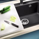 Funktionelt Blanco skærebræt i hvid plast der kan glide på kanten af kummerne i Naya-serien.