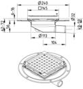 BLÜCHER Domestic-150 miniafløb for beton- og klinkegulve, med vandret Ø32mm udløb, med membranflange Kapacitet: 0,4 l/s Udløbsdiameter: 32 mm