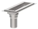 Den rektangulære afløbsrende er fremstillet af rustfrit stål og har et lodret udløb på Ø50 mm.