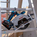 Den kompakte batteridrevne rundsav GKS 18V 57-2 Professional – med savklingen til højre – har en imponerende ydelse takket være den kraftige kulfri motor. Savklingen på 165 mm giver en savedybde på 57 mm ved 90°-snit og er optimeret med henblik på batteridrevet arbejde, så du får både hurtig skæring og maksimal batterilevetid. Den er udstyret med støvporttilslutning, som kan drejes 360° og kompatibel med Click & Clean System. Det sikrer en effektiv støvudsugning og øget beskyttelse af brugeren. Kompatibel med alle Bosch Professional 18 V-batterier og -ladere.