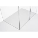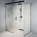 Brusehjørnet er fire-sidet og kræver ingen bagvæg for at stå stabilt. Konstruktionen forener klart hærdet glas med mat sorte profiler (RAL 9005) og et rammeløst design, der lader lyset fylde rummet og skaber visuel balance i indretningen.