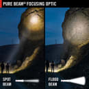 Den ene knap tænder det hvide lys, som kan justeres til den helt brede lyskegle eller den fokuserede langtrækkende stråle, blot ved at dreje på lygtehovedet.