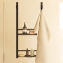 Ombukket på de bærende stænger ender ud i to håndklædekroge på bagsiden, og kombinerer på fineste vis opbevaring af badeprodukter med ophængning af håndklæder.