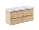Skab ro og orden på badeværelset med denne møbelpakke fra Cosmic B-Best. Her får du både et solidt underskab og en elegant dobbelt teckstonehåndvask i ét samlet sæt. Melaminoverfladen med egelook giver møblet et naturligt udtryk. Med fire skuffer er det nemt at organisere både det, du bruger dagligt, og det, du helst vil gemme væk. Perfekt til hverdage med fart på – og til dig, der sætter pris på orden og æstetik i ét.