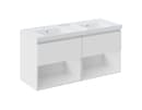 Skab ro og orden på badeværelset med denne møbelpakke fra Cosmic B-Best. Her får du både et solidt underskab og en elegant dobbelt teckstonehåndvask i ét samlet sæt. Den matte, hvide overflade skaber et lyst udtryk og får selv små rum til at virke større. Med to skuffer og to åbne hylder er det nemt at organisere både det, du bruger dagligt, og det, du helst vil gemme væk. Perfekt til hverdage med fart på – og til dig, der sætter pris på orden og æstetik i ét.