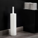 Den diskrete, cylinderformede hvide toiletbørste fra Cosmics badeværelsesserie BWC, består af børstehoved, stang og en flot rund beholder.