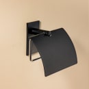 Mat sort toiletpapirholder i enkelt og stilrent design med et smart låg, som holder toiletrullen på plads, samtidigt med at det giver et rent og stilet udtryk på badeværelset.