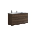 Den rummelige løsning på 121 cm byder på et vaskeskab med to skuffer og en firkantet porcelænsvask, der tilsammen skaber en rolig og harmonisk atmosfære. Det varme trælook og de rene linjer gør møblet til et naturligt samlingspunkt – uanset om du bor alene, har travle morgener med familien eller bare sætter pris på et indbydende rum.