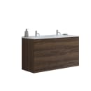 Skab og fronter er udført i melaminbelagt spånplade, så du får et møbel, der kan tåle hverdagens brug. Den firkantede dobbeltvask i porcelæn har både overløb og hanehul, så du kan vælge armatur efter din stil. Vasken er let at holde ren og modstandsdygtig over for pletter og ridser.