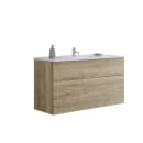 Den rummelige løsning på 121 cm byder på et vaskeskab med to skuffer og en firkantet porcelænsvask, der tilsammen skaber en rolig og harmonisk atmosfære. Det naturlige egetræslook og de rene linjer gør møblet til et naturligt samlingspunkt – uanset om du bor alene, har travle morgener med familien eller bare sætter pris på et indbydende rum.