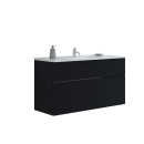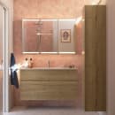 Den rummelige løsning på 121 cm byder på et vaskeskab med to skuffer og en firkantet porcelænsvask, der tilsammen skaber en rolig og harmonisk atmosfære. Det mørke egetræslook og de rene linjer gør møblet til et naturligt samlingspunkt – uanset om du bor alene, har travle morgener med familien eller bare sætter pris på et indbydende rum.