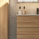 Den bløde overflade og det varme trælook skaber en rolig atmosfære, hvor du kan starte og slutte dagen med et smil. Kantate håndvasken i sanitetsporcelæn har et blødt, ovalt bassin og en glat, rengøringsvenlig overflade, der gør det let at holde badeværelset pænt. Skufferne åbner nemt, og du får fuldt overblik over dine ting – også de store flasker og små hverdagsting, der hurtigt kan forsvinde i rodet.