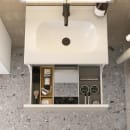 Det væghængte skab giver en let og svævende følelse på badeværelset, samtidig med at det gør rengøringen nemmere. Skufferne er designet med fuldt udtræk og soft close, så du får adgang til hele opbevaringspladsen uden at forstyrre morgenroen. Indretningen med trææsker og rumdelere hjælper dig med at holde styr på både makeup, hårprodukter og alle de små ting, der gør din dag nemmere.