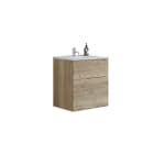 Den bløde, matte overflade og det varme trælook skaber en rolig atmosfære, hvor du kan starte og slutte dagen med et smil. Kantate håndvasken i sanitetsporcelæn har et blødt, ovalt bassin og en glat, rengøringsvenlig overflade, der gør det let at holde badeværelset pænt. Skufferne åbner nemt, og du får fuldt overblik over dine ting – også de store flasker og små hverdagsting, der hurtigt kan forsvinde i rodet.