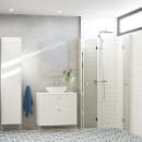 De vendbare brusedøre er 200 cm høje, og fås med profiler og runde greb i enten sort eller satin. Alle brusedøre og den faste væg kan kombineres med Tower, som er en vendbar reol med flytbare hylder, der hjælper dig til et opryddet og organiseret badeværelse.