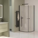 Denne brusedør kombinerer moderne design med praktisk funktionalitet. De sorte profiler giver et markant udtryk, mens den buede form og fleksible åbningsfunktion passer godt ind i både store og små badeværelser. Perfekt hvis du ønsker en løsning der ser godt ud og fungerer problemfrit i hverdagen.