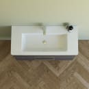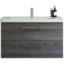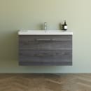 Den smukke møbelpakke fra Dansani, består af et væghængt Mido+ underskab i en flot grå farve med aftegninger af træårer, samt en Larghetto håndvask i hvidt slidstærkt sanitetsporcelæn.