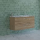 Den gennemførte møbelpakke fra Dansani består af et væghængt Mido+ underskab i en flot, varm egetræsfarve med aftegninger af træårer, samt en Amber håndvask med to bassiner i hvidt, slidstærkt sanitetsporcelæn.
