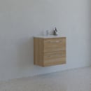 Pakken består af et væghængt Mido+ underskab i egetræs look samt en kompakt Amber Mini håndvask i slidstærkt sanitetsporcelæn.