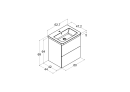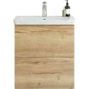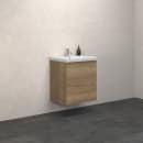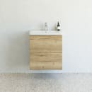 Den smukke møbelpakke fra Dansani består af et Play vægmonteret underskab i en flot egetræs farve med aftegninger af træårer samt en Larghetto håndvask i hvidt slidstærkt sanitetsporcelæn.