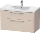 Med dette underskab fra Duravit D-Code serien får du en smuk og rummelig løsning, der samler hverdagens små og store øjeblikke på badeværelset. Den matte, beige overflade tilføjer varme og et roligt udtryk til rummet, mens de elegante kromgreb understreger det moderne design.