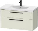 Med dette underskab fra Duravit D-Code serien får du en smuk og rummelig løsning, der samler hverdagens små og store øjeblikke på badeværelset. Den matte, lysegrønne overflade tilføjer friskhed og et roligt udtryk til rummet, mens de elegante sorte greb understreger det moderne design.
