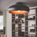 Brug denne loftlampe i entreen, stuen eller i køkkenet. Den smukke, sorte satin finish på ydersiden giver kant og kontrast til et lyst rum, og den nøddefarvede inderside tilføjer varme og stemning til lampen.
