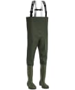 Wadersene er fremstillet i slidstærkt PVC på en base af 100% polyester, som både føles behagelig og tåler hårdt brug. Det kraftige materiale sikrer lang levetid, mens de svejsede sømme og den høje vandtæthed på 15.000 mm beskytter dig mod selv det mest udfordrende vejr. Integrerede Dunlop-støvler, justerbare seler og en praktisk brystlomme gør det let at tilpasse komforten til netop din dag.