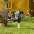 Gardena's haveslangeboks RollUp M giver dig maksimal bevægelsesfrihed, når du vander din mellemstore have. Denne slangeboks sikrer ikke kun sikker og pladsbesparende opbevaring af din haveslange, men gør også havevandingen ubesværet og enkel. Den praktiske slangeboks er forankret i jorden med et robust stativ, som kan placeres både på græsplænen eller i blomsterbedet. Ved hjælp af en monteringsstang kan du nemt skrue metalspyddet ned i jorden. Træk slangen ud til den ønskede længde, og du er klar til at vande.