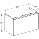 Underskabet er lavet til ONE-, Acanto, eller iCon-håndvaske i samme dimensioner og er designet med velorganiseret opbevaringsplads. Fronten består af en hel skuffe med greb, der kan udskiftes, og hvor der bag er en indvendig skuffe.