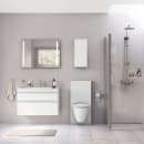 Geberit Monolith cisterne til væghængte skåle – i hvidt poleret glas med børstede aluminiums sider.