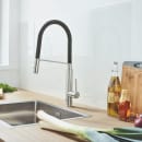 Feel køkkenarmaturet er udstyret med en GrohFlexx silikoneslange, der nemt tørres over med en våd klud, mens SpeedClean silikonedyserne nemt gnubbes fri for kalk med en finger eller klud.