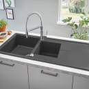 Køkkenhåndvaskene fra Grohe Kompositvaske, er fremstillet af et kvartskomposit materiale, som består af en blanding mellem granit og akryl. Dette skaber et slidstærkt materiale, med en elegant og flot glat overflade, der er let at rengøre.