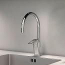 Det stigbøjleformede greb gør det let at justere både mængden af vand og temperaturen. Soft move giver let og præcis håndtering. For at komme ud i alle hjørner og afkroge af vasken kan svingtuden drejes 110°.