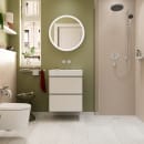 Hovedbruseren er udstyret med Hansgrohes QuickClean-funktion med bløde silikondyser, som modvirker kalkaflejringer, når de åbnes og lukkes. Eventuelle rester kan nemt gnubbes væk med fingrene. Bruseren har desuden et beslag, så vinklen kan justeres efter behov.