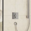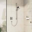Du åbner og lukker let for vandet i din foretrukne håndbruser ved blot at dreje grebet på den kvadratiske betjeningsplade til højre. Betjeningspladens minimalistiske design viser diskret, hvilken retning du skal dreje den nederste del af termostatgrebet for at justere til den ønskede vandtemperatur. Det er nemt og ligetil for enhver.