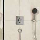 Du åbner og lukker let for vandet i din foretrukne hånd- og hovedbruser ved blot at dreje grebet på den kvadratiske betjeningsplade til enten højre eller venstre. Betjeningspladens minimalistiske design viser diskret, hvilken retning du skal dreje den nederste del af termostatgrebet for at justere til den ønskede vandtemperatur. Det er nemt og ligetil for enhver.