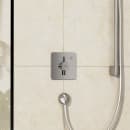 Du åbner og lukker let for vandet i din foretrukne håndbruser ved blot at dreje grebet på den kvadratiske betjeningsplade til højre. Betjeningspladens minimalistiske design viser diskret, hvilken retning du skal dreje den nederste del af termostatgrebet for at justere til den ønskede vandtemperatur. Det er nemt og ligetil for enhver.