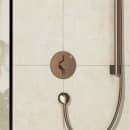 Du åbner og lukker let for vandet i din foretrukne håndbruser ved blot at dreje grebet på den runde betjeningsplade til højre. Betjeningspladens minimalistiske design viser diskret, hvilken retning du skal dreje termostatgrebet for at justere til den ønskede vandtemperatur. Det er nemt og ligetil for enhver.