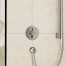 Du åbner og lukker let for vandet i din foretrukne håndbruser ved blot at dreje grebet på den runde betjeningsplade til højre. Betjeningspladens minimalistiske design viser diskret, hvilken retning du skal dreje termostatgrebet for at justere til den ønskede vandtemperatur. Det er nemt og ligetil for enhver.