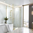 Denne betagende, messing-farvede overflade kalder Hansgrohe for "poleret guld-optik". Den smukke finish giver et strejf af varme til rummet, mens det gyldne blikfang komplimenterer både det lyse og mørke badeværelse.