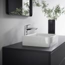 Håndvaskarmaturet er af højeste Hansgrohe kvalitet, mens designet har et elegant, blødt udtryk med kantede, svungne linjer.