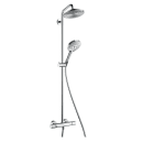 Med Raindance S bruseren i harmonisk, afrundet design får du en bruser, der opfylder alle dine ønsker. Den store hovedbruser kan indstilles, så de store, voluminøse RainAir dråber falder perfekt ned over kroppen og giver en følelse af superblød bruseregn. Hoved- og håndbruser er begge med AirPower, hvor vandet blandes med luft. Håndbruseren har Select-knap forrest på håndtaget, hvor du nemt og komfortablet klikker frem og tilbage mellem dens 3 brusestråler; RainAir, Rain og WhirlAir. Termostatarmaturet har sikkerhedsspærre ved 40 °C og justerbar varmtvandsbegræsning.