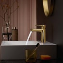 Denne betagende, messing-farvede overflade kalder Hansgrohe for "poleret guld-optik". Den smukke finish giver et strejf af varme til rummet, mens det gyldne blikfang komplimenterer både det lyse og mørke badeværelse.